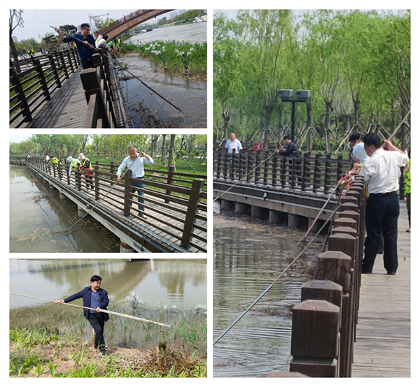 “千萬栓緊繩子!”“把救生圈帶好?!薄跋旅嫫露改喽?,把鞋帶系好,大家相互拉著慢慢走?!薄@樣的聲音,一直響徹在整場活動當(dāng)中。集團機關(guān)行動小組主要負責(zé)園區(qū)內(nèi)河道雜草的打撈清理,志愿者們在親水棧道上橫向多點布陣,巧妙地將尼龍繩捆扎在鋼制水草耙和水草鉤上,利用水流慣性接力推進各點位小片雜草的打撈工作,工作效率大大提升。為更好地配合作業(yè)機械開展清理工作,保障整治效果,各小組志愿者緊密配合、群策群力,發(fā)揮團隊優(yōu)勢,心往一處想,勁往一處使,在保證安全作業(yè)的前提下,利用既有資源,破解了一個又一個難題。