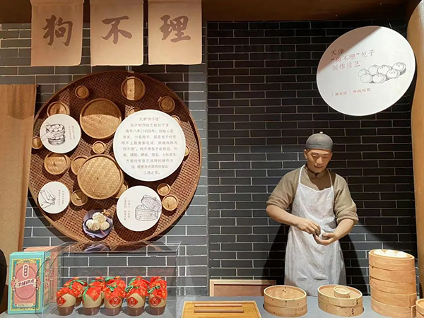 “大家現(xiàn)在看到的是天津的特色小吃:煎餅果子、狗不理包子、天津糖葫蘆、十八街麻花和耳朵眼炸糕……”來(lái)到天津段展區(qū),講解人員正在介紹古街上的各種店鋪,除美食外,還有傳統(tǒng)手工藝?yán)厦廊A手工鞋和以達(dá)仁堂為代表的傳統(tǒng)醫(yī)藥,更有獨(dú)創(chuàng)的茶壺機(jī)器人說(shuō)相聲。中心展示著天津泥人張作品《津門碼頭》,用35個(gè)泥塑人物和與之對(duì)應(yīng)的場(chǎng)景,再現(xiàn)天津三岔河口百業(yè)興旺的繁榮場(chǎng)面。