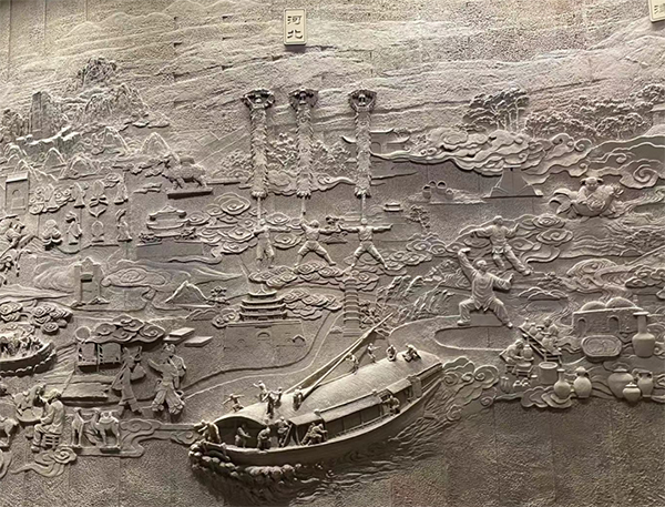 走進(jìn)一樓的中國(guó)大運(yùn)河非物質(zhì)文化遺產(chǎn)總覽廳,一塊巨大浮雕映入眼簾,展示了大運(yùn)河流域沿線8?。ㄊ校┑暮竭\(yùn)風(fēng)貌、代表性建筑景觀和非遺項(xiàng)目,盡顯大運(yùn)河非遺的精彩與壯闊。