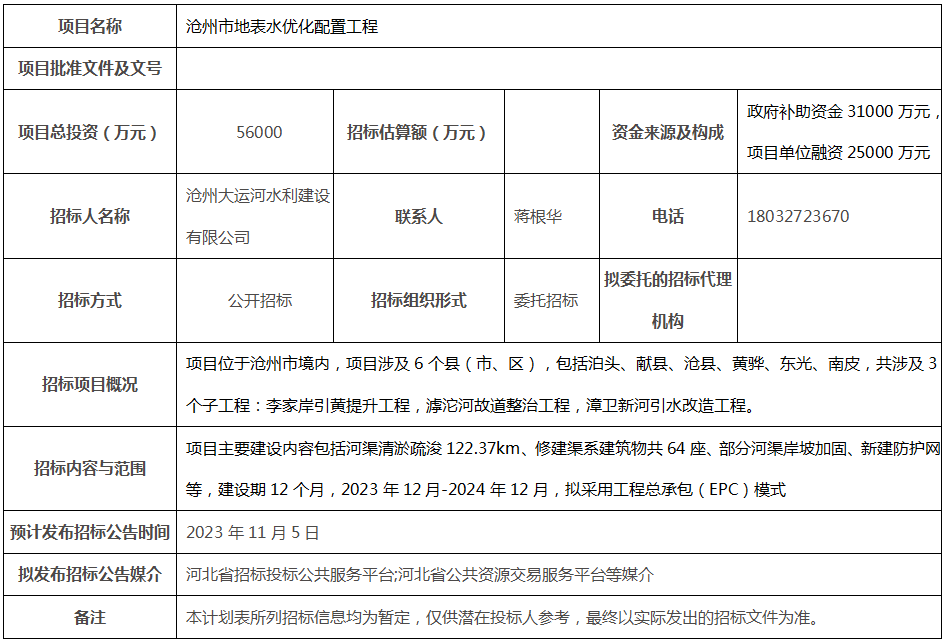 滄州市地表水優(yōu)化配置工程招標(biāo)預(yù)公告