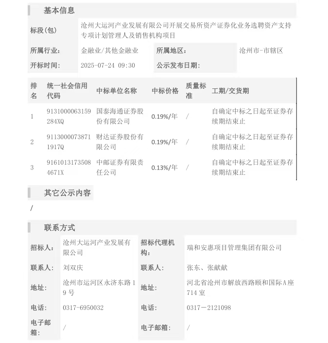 滄州大運(yùn)河產(chǎn)業(yè)發(fā)展有限公司開展交易所資產(chǎn)證券化業(yè)務(wù)選聘資產(chǎn)支持專項(xiàng)計劃管理人及銷售機(jī)構(gòu)項(xiàng)目