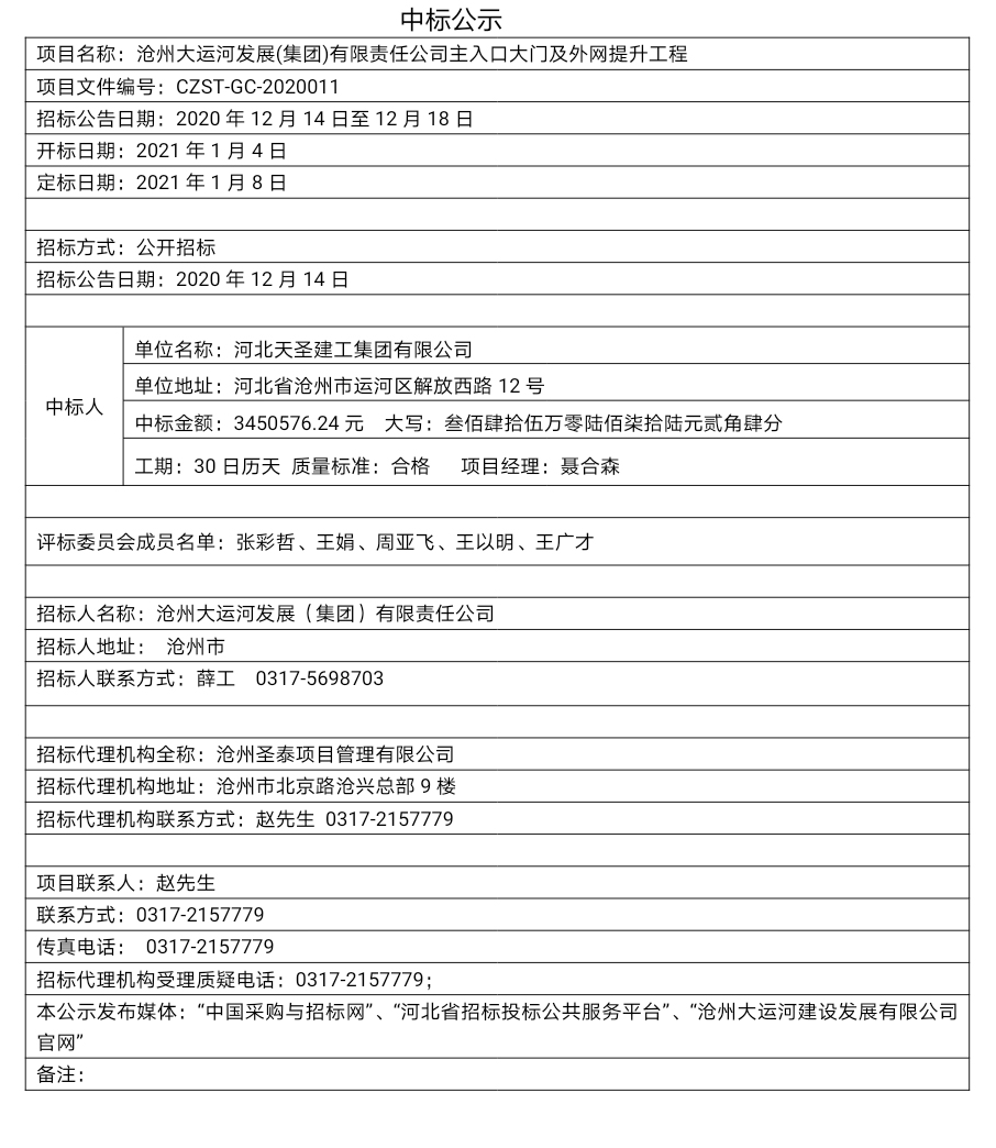 關(guān)于滄州大運河發(fā)展(集團)有限責(zé)任公司主入口大門及外網(wǎng)提升工程的中標(biāo)公示
